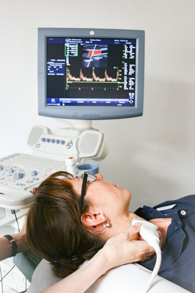Mit Ultraschall (extra- und intrakranielle Duplex-/ Dopplersonographie) wird der Blutfluß in den hirnversorgenden Blutgefäßen am Hals und im Gehirn überprüft. Hierbei können Kalkablagerungen, Verengungen und Verschlüsse von Gefäßen gefunden werden. Diese Untersuchung ist beispielsweise wichtig bei der Vorbeugung, Diagnose und Nachbehandlung eines Schlaganfalls.